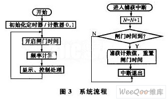 系统程序主要包括初始化定时器/计数器,捕获中断处理,频率计算,显示,开出控制等子程序,系统流程如图3所示。