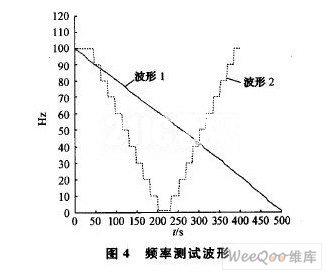 使用RIGOL函数/任意波形发生器,产生频率变化的正弦波形:① 500 S内模拟波形频率从100 Hz下降到0.2 Hz,下降梯度为0.199 6 Hz/s; ②模拟波形频率从100 Hz下降至1 Hz再从1 Hz上升至100 Hz,每10 Hz持续18 S;③每0.5 s记录一次测量数据,分别得到如图4所示波形1和波形2。