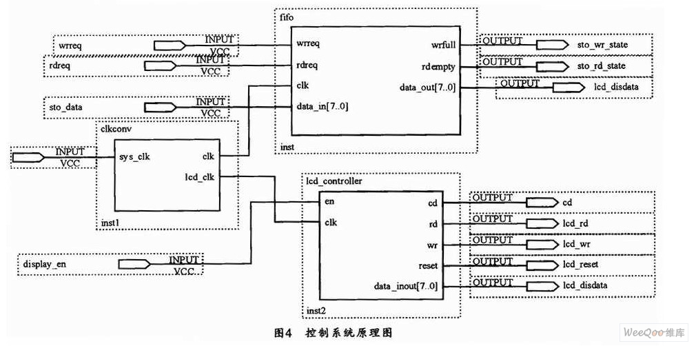 利用硬件描述语言VHDL可编程设计FPGA以控制LCM显示。本液晶显示控制器与FPGA组成显示系统后,即可先由FPGA将显示数据写入FPGA内部设计的FIFO寄存器中,当FPGA与LCM控制器进行数据交换后,再将显示数据读出并与控制信号同步送到LCM中,从而实现图形的显示。