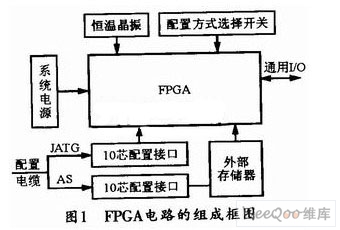 为了满足FPGA的工作条件,设计时还必须完成外部电路的设计,如外部存储器、工作电源以及外部输入时钟(即晶振)电路的设计,图1所示是FPGA电路的组成框图。