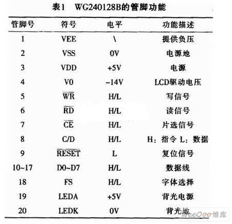 WG240128B的逻辑电源由VSS和VDD两个引脚来提供;驱动电源由V0和VEE提供;背光电源则由LEDA和LEDK提供。VSS和LEDK接地,VDD和LEDA接+5 V,DD-VO<21.7V,根据具体环境可选择VEE是否外接负压来驱动显示屏。其管脚功能如表1所列。