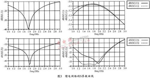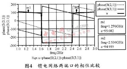 图3所示为仿真得到的S11、S21、S31、S22、S33和S23参数曲线,图4所示为加入左手结构后两端口的相位比较。