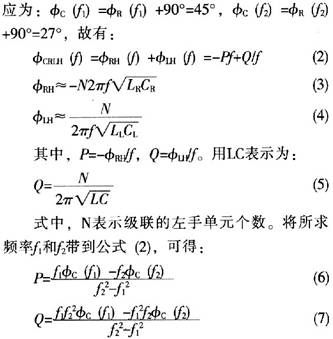 Wlnkinson功分器的结构如图2所示。该功分器可以看作一个三端口网络。端口1为输入端,端口2、3为输出端,两端间互相隔离。功分器的两个分支线的特征阻抗是。对两个输出端分别加入CRLH-TLs和传统传输线,则可使两端口具有90°的相位差。