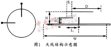 该天线的结构示意图如图l所示。该天线通过Wilkinson功分移相器将输入能量分成两路幅值相同、相位差为90°的信号。这两路信号通过探针耦合馈电到圆形辐射贴片。这种结构可以在金属棒和天线金属片之间引入更大的容抗,从而可以补偿探针本身带进来的高感抗,进一步增加天线和底板之间的高度。为了尽最大可能增加带宽,本设计引入的混合空气介质层不失为一个非常有效的方法,该方法不但可以方便地得到介电常数为1的空气层,而且可以在普通的介质层上方便的印刷馈电网络。为了扩展天线的圆极化带宽,本文使用了宽带圆极化天线结构,该天线由三部分组成,其中基于介质板的馈电网络层的输入特征阻抗为50Ω,介质板为边长W的正方形;而处在空气层中半径为Rs的L型金属棒的长度为L1,高度为H1,超出天线的边缘距离为S1;第三部分是用于辐射的金属片,其直径为D,离地面的高度为H。
