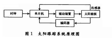 系统由时钟、单片机、驱动装置、编码器、太阳能板和传感器6部分组成。系统的核心部件是传感器和单片机。太阳跟踪系统原理见图1。