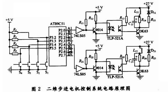 AT89C51单片机通过P2口输出控制脉冲信号,P2.0~P2.3为一路,P2.4~P2.7为一路,分两路各控制1台步进电机。P3.2~P3.5设置为行程保护开关,作二维步进电机正反向最大行程保护。功率放大电路中采用74LS05将单片机P2口脉冲信号进行放大,经9014控制光电耦合器,隔离后,由功率管DK63驱动步进电机的各相绕组,图中L11,L12即为步进电机的各相线圈。