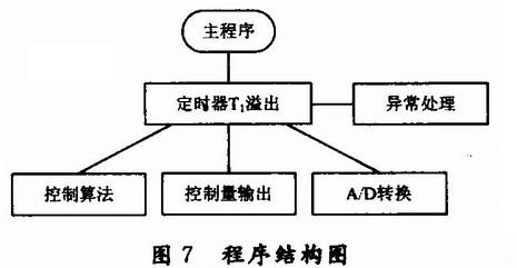 定时器1溢出中断服务程序包含多个模块,先后在一个T1溢出周期内执行完毕。这些模块包括:控制算法、控制量输出、A/D转换、转换结果处理和分析、异常处理等部分。通过每次T1溢出,周期性的采样、反馈比较、调整、输出,从而实现控制策略。