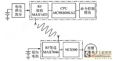 系统的安全性也是一项主要考虑的因素。通过采用Microchip公司专为RKE系统设计的使用DES算法的安全密钥芯片HCS300来实现系统数据的安全加密,防止发送的数据被恶意盗取拷贝;同时在接收端使用MC9RS08KA2进行解密和继电器控制。