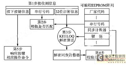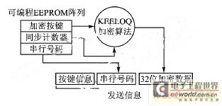16位的同步计算器,在每次发送代码后都要发生改变。它随按键的次数而增加。根据DES算法加密,在每次发送的代码中,由于同步计数器的变化而 使得每次发送的代码有大于50%的部分不一样。图2说明在编码过程中如何使用HCS300的内部可编程EEPROM,一旦编码器检测有按键按下,它就立即 读键值,同时刷新同步计数器。按键和同步计数器经过加密算法处理,输出数据是32位的加密信息。携带按键信息的32位代码和串行码组成了整个发送码,将被 接收部分接收到。