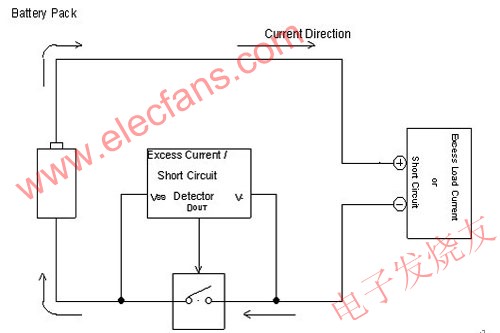 因不明原因导致短路而有大电流耗损时,为确保安全而使之停止放电。在过电流的侦测是以Power MOS的Rds(on)为感应阻抗,以监视其电压的下降,此时的电压若比过电流侦测电压还高时即停止放电。为了使Power MOS的Rds(on)在充电电流与放电电流时有效的应用,需使该阻抗值尽量低,(目前约20mΩ ~30mΩ )。如此,过电流侦测电压就可较低。
