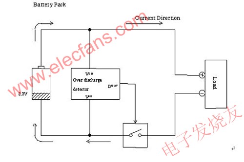 过度放电保护IC原理:为了防止锂电池过度放电之状态,假设锂电池接上负载,当锂电池电压低于其过放电电压检测点(假设设定为2.3V),将激活过放电保护,将Power MOS由ON'OFF,进而截止放电,达成保护以避免电池过放电现象发生, 并将电池保持在低静态电流的状态(standby mode),此时耗电为0.1uA