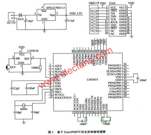 EasyARM615主机是系统控制和管理的核心,完成号票的打印和号码的存储、管理、显示、发送及语音播放等功能。顾客来到后,在主机上按“取号”键,系统将排队人数和排队号码加1,同时打印顾客的号码并存储。当窗口工作人员按“下一位”键取号时,主机将排在最前的号码发往呼叫器、相应的窗口显示屏和主显示屏,并通过语音模块播放语音,同时将系统的排队人数减l;当窗口工作人员按“重呼”键或“暂停”键时,从机向主机送出该窗口数据,主机收到后立即将该数据发往呼叫器、相应的窗口显示屏和主显示屏,并通过语音模块播放语音。主机控制器电路如图2所示。