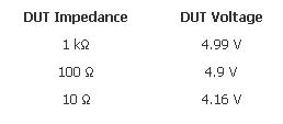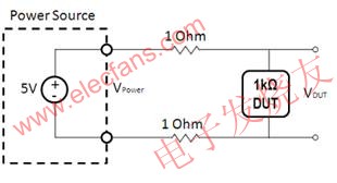 假设电源器件的输出为5V,DUT的阻抗为1k。按照下列公式,可以计算出DUT终端的实际电压: