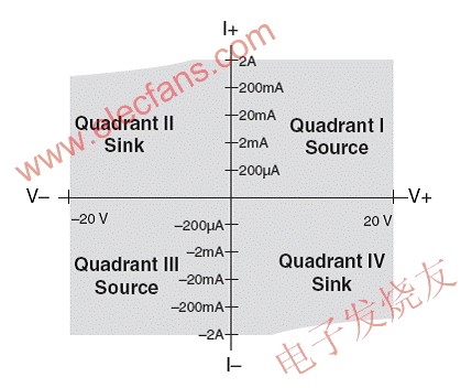 SMU的另外一个特性便是输出的灵活性。SMU具有4象限输出,可以提供正电压正电流(第一象限)、负电压正电流(第二象限)、负电压负电流(第三象限)和正电压负电流(第四象限)。典型地,SMU的数据手册中会包含一幅与图2类似的象限图,显示了在每个象限内可使用的最大电压和电流。吸收象限区中通常采用一条实线表征持续功率耗散,采用一条虚线表征在脉冲模式下吸收电流的能力。理解这种差异是很重要的,因为SMU的持续功率耗散能力可能比它的脉冲耗散能力要小得多。