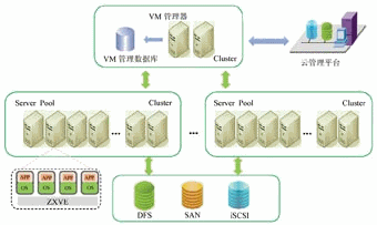 (3)动态资源调配:虚拟存储、网络创建、配置、修改和删除等能力。当一个VM的内存、外出或网络资源不足时,可临时借用同节点中其他VM暂时不使用的同类资源。