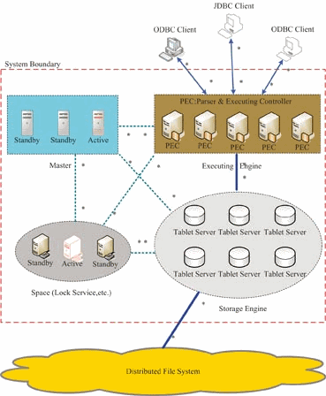 (1)PEC:解析执行服务器(Parsers & Executing Controllers,简称PEC),SQL服务接入点。负责接收客户的SQL请求,并定向到特定的Tablet服务器上进行数据访问。