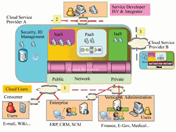 从业务提供方式上,云可以提供3种业务:IaaS将虚拟化的资源直接按需提供给客户;PaaS在虚拟化的云计算平台上建立支持多种业务的应用平台,再将应用接口和开发环境、运行环境提供给外部;SaaS在虚拟化的云计算平台上提供按需定制和快速部署的应用软件租用服务。目前,业界研究最多的是IaaS和PaaS,本文将针对IaaS(对应基础云)和PaaS(对应业务云)的关键技术,实现方案以及云的标准化进行阐述。