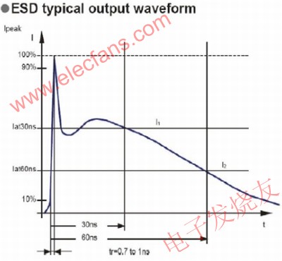 这种ESD防护能力还不足以在为所有ESD状况或从电源线和其他来源感应的高电压提供保护。一个脉冲宽度为60ns的典型ESD波形如图3所示。