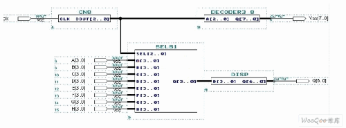 将各个模块连接起来构成整体电路图如图 1.9 所示,可以实现用CPLD 设计一个驱动八位数码管显示电路的功能。clk 是时钟脉冲输入信号,经过时钟脉冲计数器CN8 模块,将信号以3 位2 进制数的形式输出,输出信号是COUT[2..0]。时钟脉冲计数器CN8 的输出同时作为3 线—8 线译码器DECODER3_8 和八选一数据选择器SEL81 地址码SEL[2..0]的输入。时钟脉冲计数器CN8 的输出经过3 线—8 线译码器DECODER3_8 译码其输出信号Vss[7..0]接到八位数码管的阴极Vss7、Vss6、Vss5、Vss4、Vss3、Vss2、Vss1、Vss0 端,决定点亮哪位数码管。同时时钟脉冲计数器CN8 模块输出的信号也进入数据选择器SEL81 地址码SEL[2..0]的输入,进行输出数据的选择,其输出是Q[3..0]。八选一数据选择器SEL81 模块的输出是Q[3..0]再经过七段译码器DISP 模块,将其翻译成可以用数码显示管的数据。七段译码器DISP 模块的输出Q[6..0]分别经300 欧电阻接数码显示管的a~g 管脚。八选一数据选择器模块的输入端,可根据具体需要进行设计。