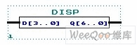 七段译码器模块 DISP 如图1.8 所示。DISP 模块是七段译码器,将输入的4 位二进制数转换为数码显示管所对应的数字。例如输入为4 位二进制数0000 的时候,使数码显示管显示0,则要七段译码器输出为0111111,即g 段为0,g 段发光二极管不亮,其他发光二极管被点亮,显示效果为0。DISP 模块输入信号D[3..0]接到八选一数据选择模块的输出信号Q[3..0];七段译码器输出信号Q[6..0]接数码管的a~g 管脚。