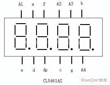 CL5461AS 数码管管脚图如图1.2 所示,它将四个数码显示管的a~g 及小数点dp 管脚并联在一起,作为数码管数据输入端;分别引出各个数码管的阴极A1~A4。
