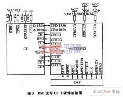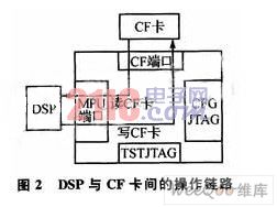 通过在MPU端口处连接DSP来实现DSP对CF卡的读写,图2为DSP读写CF卡的示意图,图3为硬件连接图。