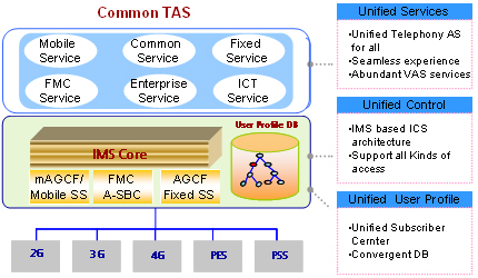 Common TAS除了要实现FBB、MBB共同需要的基本话音和视频业务功能集合,还需要包含传统固定、移动网络的一些常用业务,如固定CS网络中的热线、闹钟,移动CS网络中的预付费业务、彩铃等。为了实现企业客户的要求,Common TAS中还需要包含IP Centrex等高级话音业务特性,用于企业市场场景的应用。有了这三组功能集,基本上可以实现终端用户在不同接入方式间转换时,对基本业务功能集体验的一致性。此外,Common TAS还需要提供更多的增值业务,如FMC类增值业务、ICT类增值业务等。