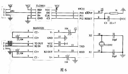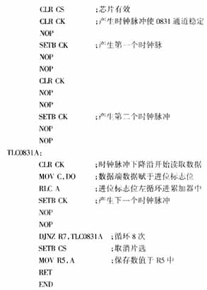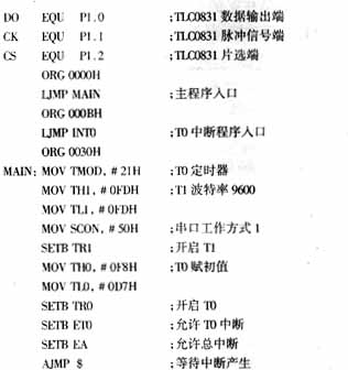 下面给出单片机软件部分的主要程序。波特率设置为9600,用定时器1产生波特率,串口工作在方式1,无奇偶校验。定时器0设定采样的时间间隔。TLC0831为A/D转换器数据采样子程序,SEND为单片机发送子程序。