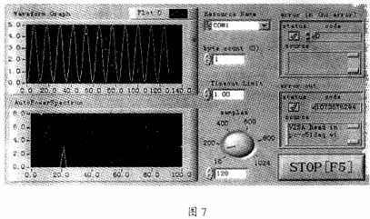 本文利用单片机进行前端数据采集,通过串口实现与LabVIEW的数据通讯,利用LabVIEW的强大信号分析处理功能,开发了一套投资少、操作简便的数据采集与信息分析系统(其虚拟面板如图7所示)。实验证明,该系统运行良好。