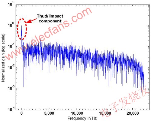 图 2:频域内的玻璃破损信号在频域方面,我们也面临着类似的挑战。玻璃破损信号分量好像是以相对平均的能量分布于整个频谱,这与典型的白噪声类似。不过,我们也发现,在 200 ~ 300 Hz 的低频区域有一个不小的峰值,这给我们做出区分判断提供很有用的信息。这一峰值是玻璃破损过程中击打物撞击玻璃所最初产生的声音频率分量。撞击表现为后续高频玻璃破损声中的低频信号。这种“撞击”或者“重击”也可以理解为器具碰撞玻璃时所发出的声音。这种信号在时域波形中很难分辨出来,但我们确实清楚这种声音是在玻璃破损过程中先于其他声音而发生的。据此,我们可以确定地列出玻璃破损信号的部分有关因素:包括大量高频分量,即包含大量跨零和峰值。
