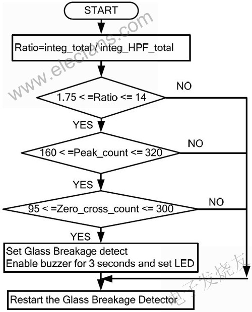 图 7:信号分析 2 的软件流程计算总信号能量与高通过滤信号能量之比,并将其与阈值加以比较。结果显示众多玻璃破损声音的比值都介于 1.75 ~ 14 之间。同样,还要检查峰值数量是否介于 160 ~ 320 之间,跨零数量是否介于 95 ~ 300 之间。只有满足以上三个条件,才能确定发生了玻璃破损事件。上述三个条件中只要有一项不符合要求,玻璃破损检测器就会重启并返回活动检测状态。这些阈值与范围将需要根据房间声音质量、GBD 位置以及环境噪声等加以微调。