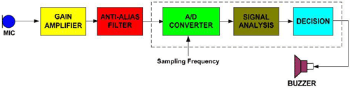破损玻璃检测器 (GBD) 主要用来检测家庭住宅或商业楼宇门窗玻璃的破损情况。GBD 也可归类为一种监控设备,用以提高家庭或商业环境的安全性,避免非法进入。GBD 既可独立工作,也可与其它防盗设备协同工作,形成一套完整的安全系统。GBD 的基本工作原理就是捕获各种声音,并对其进行分析,然后报告玻璃是否破碎。基于这种工作模式,GBD的性能很大程度上取决于声源音质,这对设计人员提出了诸多挑战。此外,GBD 必须排除各种非真正玻璃破碎发出的声音,这种可能触发虚假玻璃破碎警报的声音事件就是误报警。本文将介绍一种采用低成本微处理器 (MCU) 的高效、稳健可靠的 GBD 设计方案。MCU 属于低端处理器,广泛用于简单的数字实时时钟或复杂的智能计量装置等各种应用。MCU 之所以能够广泛应用,主要是因为其相对于大多数其他类型的数字处理器而言具有低成本、低功耗、简便易用等优异特性。在简单应用中,由于要求不多,因此低成本和低功耗很容易实现。然而,随着 MCU 不断应用于复杂的应用,要想保持低成本和低功耗就要面临更大的挑战。因此,工程师目前的任务就是以尽可能低的成本实现最佳性能。为了实现这一目标,我们必须解决诸如片上内存较低、外设集有限、运行速度较低、引脚数量较少等 MCU架构限制问题。同时,工程师必须优化利用 MCU 的一切可用资源,才能使其在像破损玻璃检测器 (GBD) 这种相当复杂的应用中充分发挥作用。