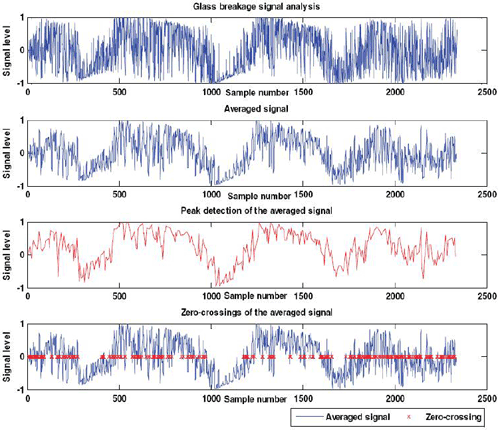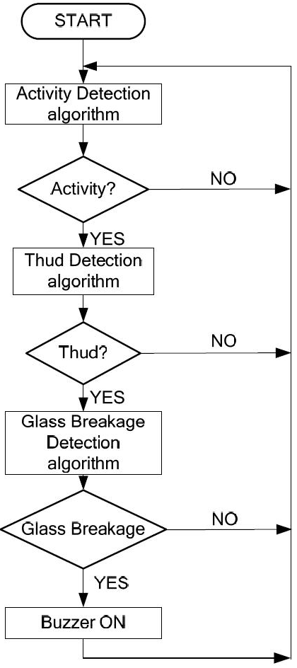 扩音器的模拟信号由剪切频率为 20 kHz 的 AAF 过滤。为了对该信号进行数字化,采样率必须大于 40 kHz,也即 ADC 必须能够支持它。在实时运行状态下,所需的处理工作需在连续采样间隙完成。例如,如果最高 CPU 频率为 12 MHz,那么连续采样之间的 CPU 周期数仅为 300 次,这对信号处理而言是极为不足的。为了增加 CPU 周期,我们可选用支持更高 CPU 时钟的处理器;但是,这样做的代价是提高了功耗,进而缩短了电池使用寿命。因此,必须平衡算法复杂性和电池使用寿命。本节将探讨用于检测玻璃破损的实际算法。从图 1 和图 2 中可以看出,玻璃破损声音包含大量高频分量、跨零和峰值,以及低频撞击信号。重击或撞击发生在玻璃破损声音的起始阶段。必须注意的是,重击/撞击信号可能源于多种声音,比如木门或柜橱的关闭、物品掉落地上、快速击掌、锁门等。不过,这些声音都不存在一般玻璃破损信号中包含的高频分量。同样,咖啡磨豆机、音乐、电视上的摩托车比赛、酒杯落地破损等发出的声音尽管存在高频分量,但却没有重击/撞击分量。下述 GBD 算法将探究这两种分量及时独立出现在频谱两侧的事实。