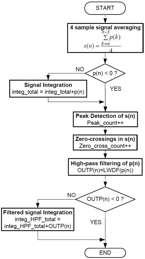 图 6:信号分析 1 的软件流程传送进来的信号样本 p(n) 在首先通过简单的移动平均滤波器降低噪声后得到 s(n)。p(n) 的信号整合只使用正样本进行,以便计算出 SA2 阶段将使用的信号能量 integ_total。s(n) 包括峰值和跨零数量。可以使用剪切频率为 的高通滤波器 (HPF) 提取传送进来的信号的高频分量,每个 p(n) 样本都要经过此类过滤。同时,只有过滤输出的正样本才能累加到结果 integ_HPF_total 中,该结果将用于 SA2 阶段。每个样本都要经过完整的 SA1 阶段,而且为了确保实时运行,必须在下一个样本 p(n+1) 到达前完成,即全部可用的 CPU 周期数仅为 CPU 频率/40 kHz。过滤通常是一个耗时的过程。为提高效率,我们在撞击检测中使用的 LPF 以及 SA1 阶段使用的 HPF 中均要采用点阵波数字滤波器 (LWDF) [1] ,并使用霍纳 (Horner) 算法 [2]。待 SA1 阶段的数据处理完(耗时 60 毫秒)后,算法即进入处理的第二个阶段 SA2。SA2 无需实时运行,图 7 给出了该阶段的运行流程。此外,SA2 完成时将确定是否真的发生了玻璃破碎事件。