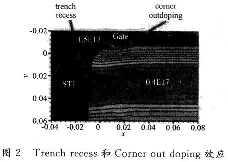 图1中,NMOS的W和L分别为10μm和0.18μm;Vsource=0;Vdrain=0.1 V;Vsub=0,-0.45 V,-0.9 V,-1.35 V,-1.8 V;Vg从0升到1.8 V。近几年,人们对这种失效现象做了大量的研究。人们普遍接受,晶体管的侧壁寄生晶体管的预先开启是漏电的根本原因。理论上讲,由于粒子注入的有效掺杂浓度在晶体管的中心区域和侧壁位置的不同,导致了侧壁寄生晶体管的预先开启。在MOS的基板加有反向电压时,双峰现象特别明显。图2中TrenchrecesS和Corner out-doping这两种现象可以被用来解释为什么晶体管的侧壁位置粒子注入的掺杂浓度会不同于晶体管中心位置(通道正下方)。由于Trenchrecess和Corner ou-doping这两种现象是不可避免的,所以人们尝试了很多种方法去优化掺杂的有效浓度分布,以期降低和消除双峰效应。