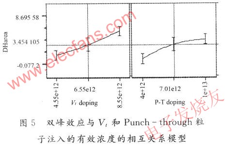 从图4可以看出模型的精确度(Rsquare)为O.97。这表明,粒子注入浓度和双峰效应具有非常强的相关性。图5显示,双峰效应对Vt的注入浓度非常敏感。随着浓度的上升,双峰效应越来越明显。这个现象和现有的理论相吻合。由于Vt的注入能量为25 kev,有效掺杂浓度的峰值靠近MOS通道的表面。并且硼的吸出效应(out-doping)明显,随着粒子注入浓度的升高,通道正下方的有效掺杂浓度上升,但侧壁位置的有效浓度变化不大,致使这两个位置的浓度差异增加。同时,硼的有效浓度的增加,会导致通道正下方的阈值临界电压Vt的上升。这个变化会使得MOS通道下方开启时间延迟,从而侧壁寄生晶体管的预先开启时间变长,进一步导致漏电量的增加。同理,采用的双峰效应的量化评估值就会增加,双峰效应明显。与Vt注入相比,Punch-through注入的浓度变化对双峰效应的影响不明显。这是因为铟元素的吸出效应不明显,所以铟的有效浓度的变化对通道正下方和侧壁位置的有效掺杂浓度的差异贡献不大,从而双峰效应对铟的浓度变化相对不敏感。