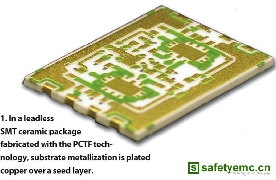 采用无引脚的陶瓷SMT技术的优点很多,采用PCTB技术制造陶瓷SMT封装,陶瓷衬底始终是无引脚SMT封装的基底,上面覆盖一层环氧材料的覆盖层,或者使用金属环型框架/盖板形成气密的腔体(图1),。采用在种子层(seed layer)上镀铜,最后镀镍-金层,实现衬底的金属化。因此该封装可以承受多次焊接以及+400°C的高温。该方案还支持标准装配技术,例如高温合金芯片粘合、环氧材料粘合、BGA(ball-grid-array)封装、倒扣封装以及ribbon键合技术。PCTF封装还可以采用无磁性材料,适用于核磁共振成像MRI(magnetic-resonance-imaging)系统等无磁应用。