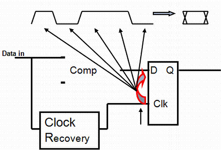 图1: 串行数据中的抖动,每个时钟的数据级、上升沿和下降沿都在D处表示出来。数据锁存是数据通信的关键环节,在示波器上以眼图形式显示。