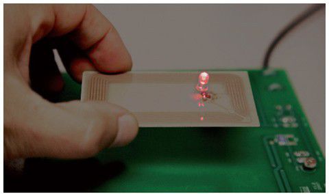 图6: 该RFID标签作为一个简单的测试探针使用,其RFID芯片被一个发光二极管(LED)所取代