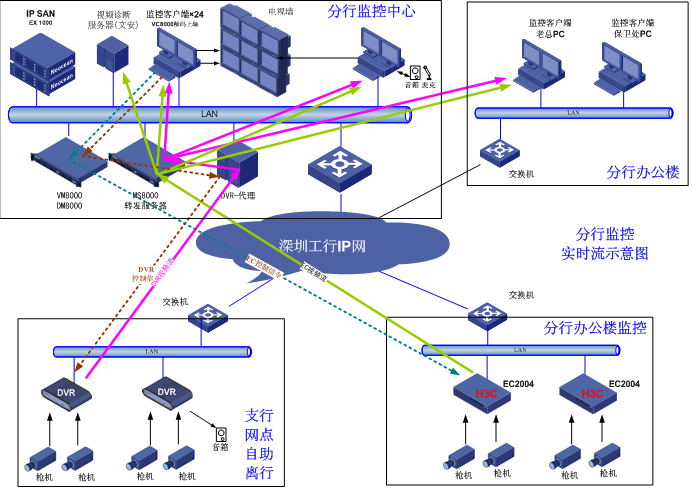 在对业内不同厂商产品进行了调研之后,深圳工商银行选择了H3C提供的金融网点联网监控解决方案。整个方案依托深圳工商银行IP网,将分行、支行、网点等不同监控点联入一张监控“大网”,并接入到分行监控中心,实现了对所有网点的全局掌控。