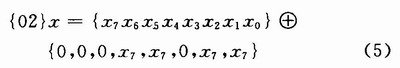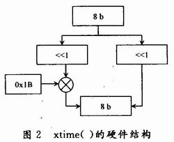 ,式(8)只需要4个异或门就可实现。将该单元记为xtime()函数。其硬件结构如图2所示。加密时所取的系数较小{01,02,03},所以只需经过一次xtime()单元,便将乘法运算转换为移位操作和加法运算的复合。