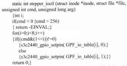 利用应用程序传递给stepper ioct1的参数arg来判断转动方向。编写ioctl函数用来接收应用程序对于步进电机的控制。以下是部分驱动程序代码: