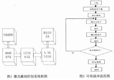本系统主要控制两个两相混合式步进电机,分别代表X轴和Y轴带动传能光纤进行激光雕刻。系统采用8路I/O口进行脉冲输出,每4路接一个步进电机驱动器,通过功率放大后,进入步进电机的各项绕组。电机有半步、整步两种工作模式,整步模式的步距角为1.8°,半步模式的步距角为0.9°,整步一周共200步。如:半步模式的两步进电机正转脉冲为{0x11,0x33,0x22,0x66,0x44,Oxcc,0x88,0x99};整步模式为{0x11,0x22,0x44,0x88,0x11,0x22,0x44,0x88},一个步进电机运作时,只对脉冲时序的高或低4位操作,另外4位为0。而改变脉冲的顺序,即可改变转动方向。在整个控制系统中,数据处理在Linux应用程序中完成,步进量传递给Linux驱动程序后,由驱动程序完成脉冲输出。通过软件来完成脉冲分配,可根据应用系统的需要,随时改变对步进电机的控制。