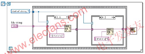 首先,Trim Whitespace.vi被内联到调用VI,如图4所示。现在,不可达代码与死码删除运算可以简化代码。第一个条件结构将总是执行相同的分支,因为输入的是一个恒定值。因此,其余的分支可以同整个第二个条件结构一起移走,因为它们从不执行。循环不变式代码移动将匹配模式基元(Match Pattern primitive)移出循环框,确保其只被执行一次,如图5所示。