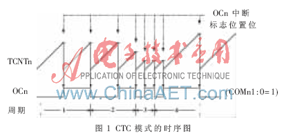 ATmega16的timer0的CTC模式可通过令控制寄存器TCCR0的WGM01=1和WGM00=0来设定。寄存器OCR0用于调节计数器的分辨率,当计数器的数值TCNT0等于OCR0中的值时计数器清零,即OCR0定义了计数器的TOP值,亦即分辨率。这个模式使得用户可以很容易地控制比较匹配输出的频率。CTC模式的时序图如图1所示。计数器数值TCNT0一直累加到TCNT0与OCR0匹配,然后TCNT0清零。