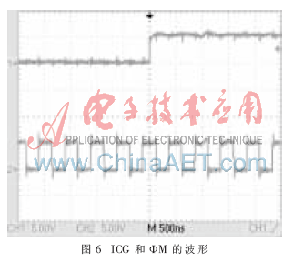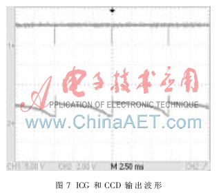 用示波器测量图4所示电路产生的SH和ICG波形如图5所示。通道1为SH波形,通道2为ICG波形,SH的高电平相对于ICG的低电平有一定的延时且宽度较窄。图6为ICG和ФM的波形图,通道1为ICG波形,图中显示出了上升沿部分,通道2为ФM波形。CCD的输出信号波形和ICG如图7所示,通道1为ICG波形,通道2为CCD波形。
