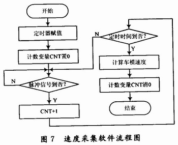速度传感器由红外反射式传感器和施密特触发器组成,经过施密特触发器整形后信号的频率与速度相关,通过测量该信号频率计算车模行驶速度。在Windows CE中,API函数SetTimer()可以设置定时器编号和定时时间,当定时时间到达时,执行消息响应函数OnTimer。速度采集流程如图7所示。调用SetTimer函数设置定时器初值,当外部中断EINT_19产生时,即一个脉冲信号到来,计数变量CNT加1,当SetTimer()函数设置的时间到来时,执行OnTimer()函数,该函数负责计算车模速度并将计数变量CNT清0。