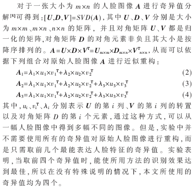 自20世纪90年代以来,人脸识别技术已成为计算机视觉、模式识别和信息技术等领域研究的热点课题之一,并且在此基础上提出了主成分分析PCA(Principal Component Analysis)[1,2]、二维主成分分析2DPCA(Two-Dimensional Principal Component Analysis)[3]、双方向的二维主成分分析[4]和线性鉴别分析LDA(Linear Discriminant Analysis)[5]等有效的识别方法。但是,现有的正面人脸图像的识别方法,仅当有充分数量的有代表性的人脸图像样本时才能取得较好的识别效果。然而在一些特殊场合,如法律实施、海关护照验证和身份证验证等,每类(人)只能得到一幅图像,此时就只能用这些数目有限的图像去训练人脸识别系统。若用前面提到的那些方法处理这种训练样本数目有限的人脸识别系统,识别率会明显下降,甚至变得不再适用。参考文献[6]首先对原始人脸图像利用奇异值分解,然后运用分解得到的较大的几个奇异值对原始人脸图像近似重构,并且将重构人脸图像和原始图像一起作为训练样本,从而对原训练样本个数进行扩展,再对增加了训练样本后的样本集运用2DPCA方法进行特征抽取,该方法可取得较好的识别效果。但是由于人脸图像存在姿态、表情等变化,而且这个变化越大,算法的识别误差也越大。基于此,本文提出了一种基于图像镜像和奇异值分解的镜像奇异值分解方法。该方法首先对人脸图像做镜像变换,然后对原始人脸图像和镜像图像分别做奇异值分解,接着用较大的几个奇异值分别对原人脸图像重构,将这些重构图像、原图像以及镜像图像一起作为训练样本运用(2D)2PCA方法对其进行特征抽取,最后使用基于最小欧氏距离的分类方法对样本集进行分类识别。由于考虑了人脸图像的旋转等姿态变化,在ORL人脸数据库上的实验结果表明,该方法比参考文献[6]中的方法有更好的识别性能。