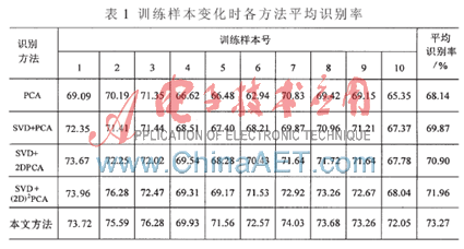 为了对各方法的识别效果进行对比,本文分别对单样本PCA算法、SVD+PCA算法、参考文献[6]中提出的SVD+2DPCA算法、SVD+(2D)2PCA以及本文提出的方法在ORL人脸数据库上进行10组实验,即分别将每个人的第1,2,3,...,10幅共40幅人脸图像作为训练样本,而其余的360幅图像作为测试样本进行分类识别,然后取其平均识别率,测试结果如表1所示。以下(2D)2PCA方法中行方向降维维数为10,即只对其列方向维数做变化。