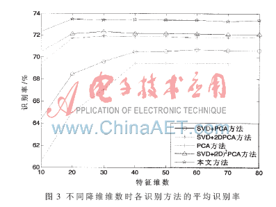 不同的特征提取方法的确会对系统识别率的提高有一定的影响,为了验证本文方法识别率的提高不仅仅依赖于(2D)2PCA特征提取方法的选择,而是由于镜像人脸图像样本的增加,实验中分别对单样本PCA算法、SVD+PCA算法、SVD+2DPCA算法、SVD+(2D)2PCA算法以及本文算法在ORL人脸库上,同样分别将每个人的第1,2,3,...,10幅图像作为训练人脸图像,而将其余的360幅作为测试样本,取同一特征向量维数下的10组实验的平均识别率作为其最终识别率,测试结果如图3所示。
